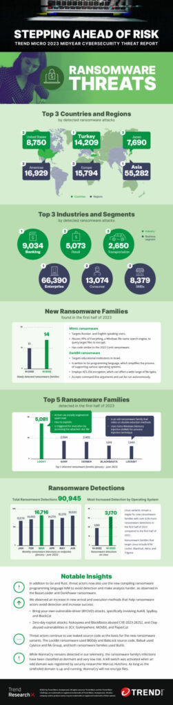 Im ersten Halbjahr 2023 wurden 90.000 Ransomware-Angriffe auf Endgeräten erkannt. Im Vergleich zum selben Zeitraum im Vorjahr stieg die Anzahl der von Ransomware betroffenen Linux-Systeme um 62 Prozent. 14 neue Ransomware-Familien sind seit 2023 im Umlauf. Dieser Anstieg lässt sich laut Trend Micro mit zunehmenden Einsatz von neuen Technologien wie generativer KI und anderen Tools erklären. So nutzte die neue Gruppe Mimic im Frühjahr eine Lücke im legitimen Suchtool Everything, um zu bestimmen, welche Dateien verschlüsselt werden sollten. Zudem steigt auch das Ausmaß der Kollaboration zwischen den verschiedenen Ransomware-Gruppen wie Conti, TargetCompany und BlueSky, was zu geringeren Kosten und höherer Operationseffizienz führt.